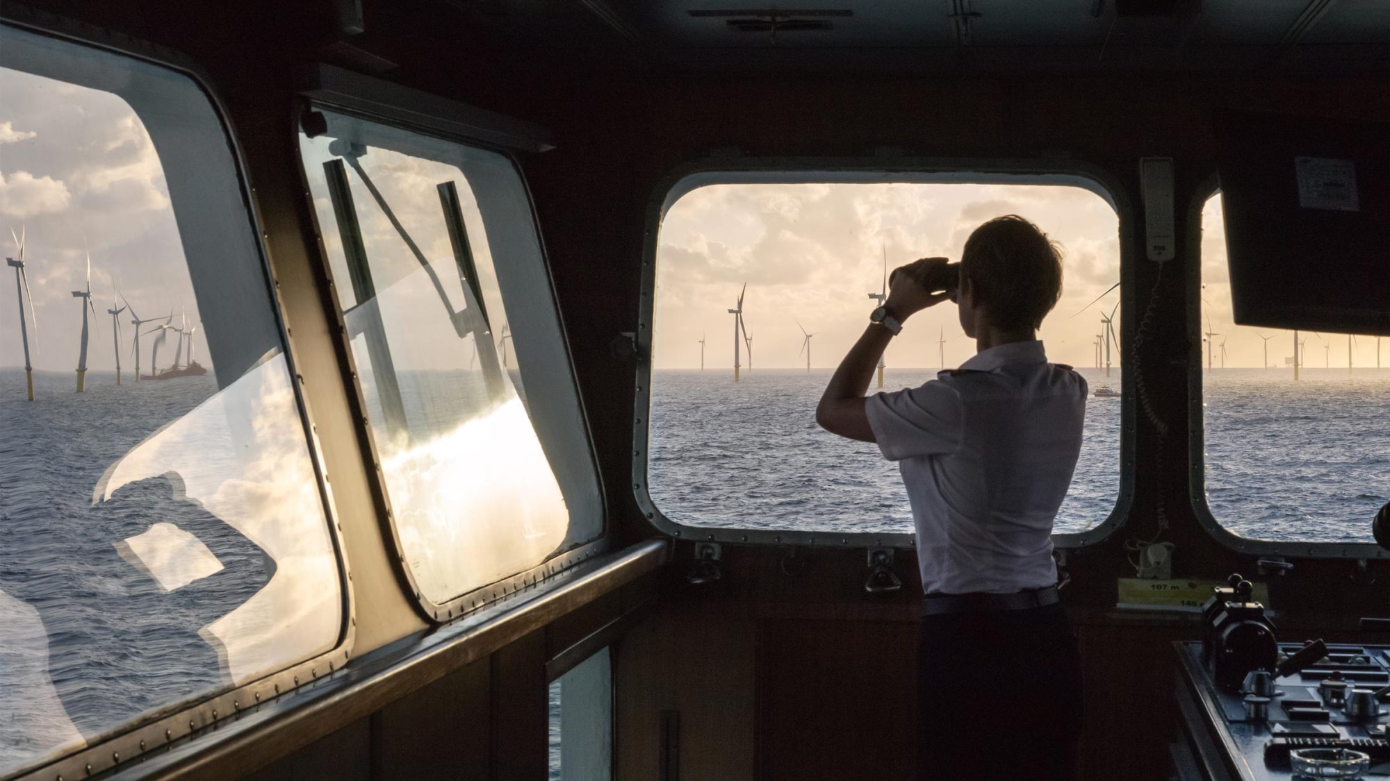 Photo by Luca Locatelli — Energiewende, Regina Baltica, Germany, 2015. Regina Baltica vice captain overlooking a wind farm in the North Sea, Germany. Regina Baltica serves as a floating hotel for offshore windfarm technicians.