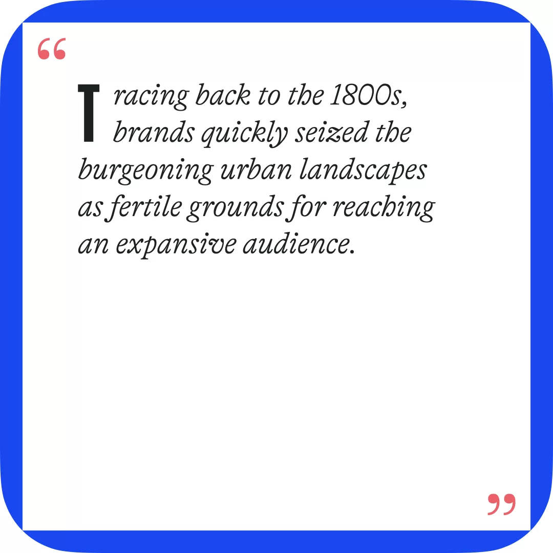 Already in the 1800s, brands were quick to seize the burgeoning urban landscapes as fertile grounds for reaching an expansive audience, a strategy later employed by brands such as Coca-Cola with their iconic billboards at the beginning of the 20th century.