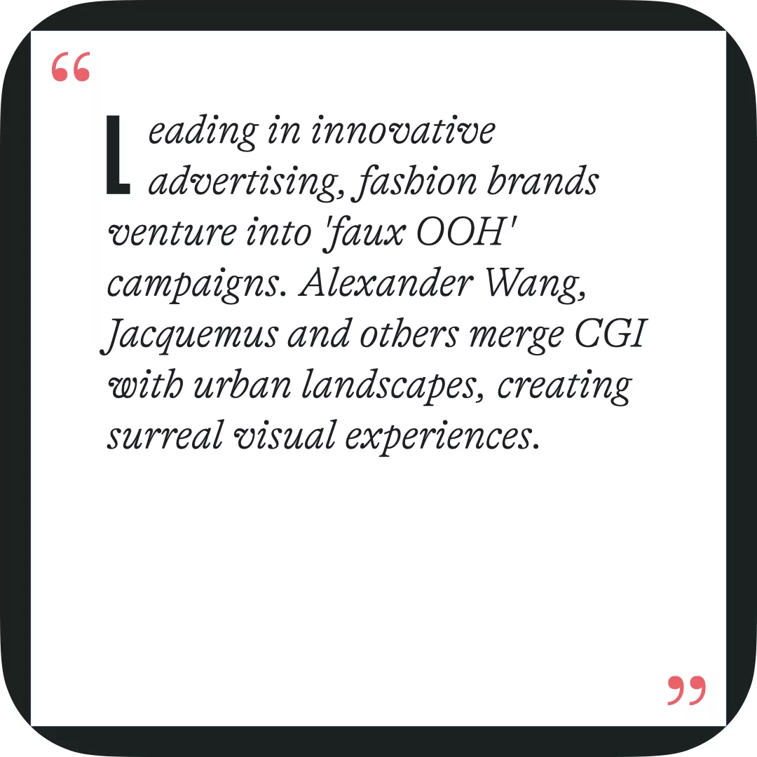 Hand in hand with the evolution of humans and their quintessential living space, brands today are exploiting cities as spaces to experiment with new approaches, make innovations, and stage immersive experiences, such as out-of-home advertising and surrealist marketing campaigns. In real life or in the digital realm, brands transform everyday cityscapes into stages for imaginative experiences, engaging with audiences in a manner that transcends traditional marketing boundaries. From billboards that blend seamlessly into the skyline to interactive installations that turn city streets into living canvases, brands are redefining how urban spaces are experienced.