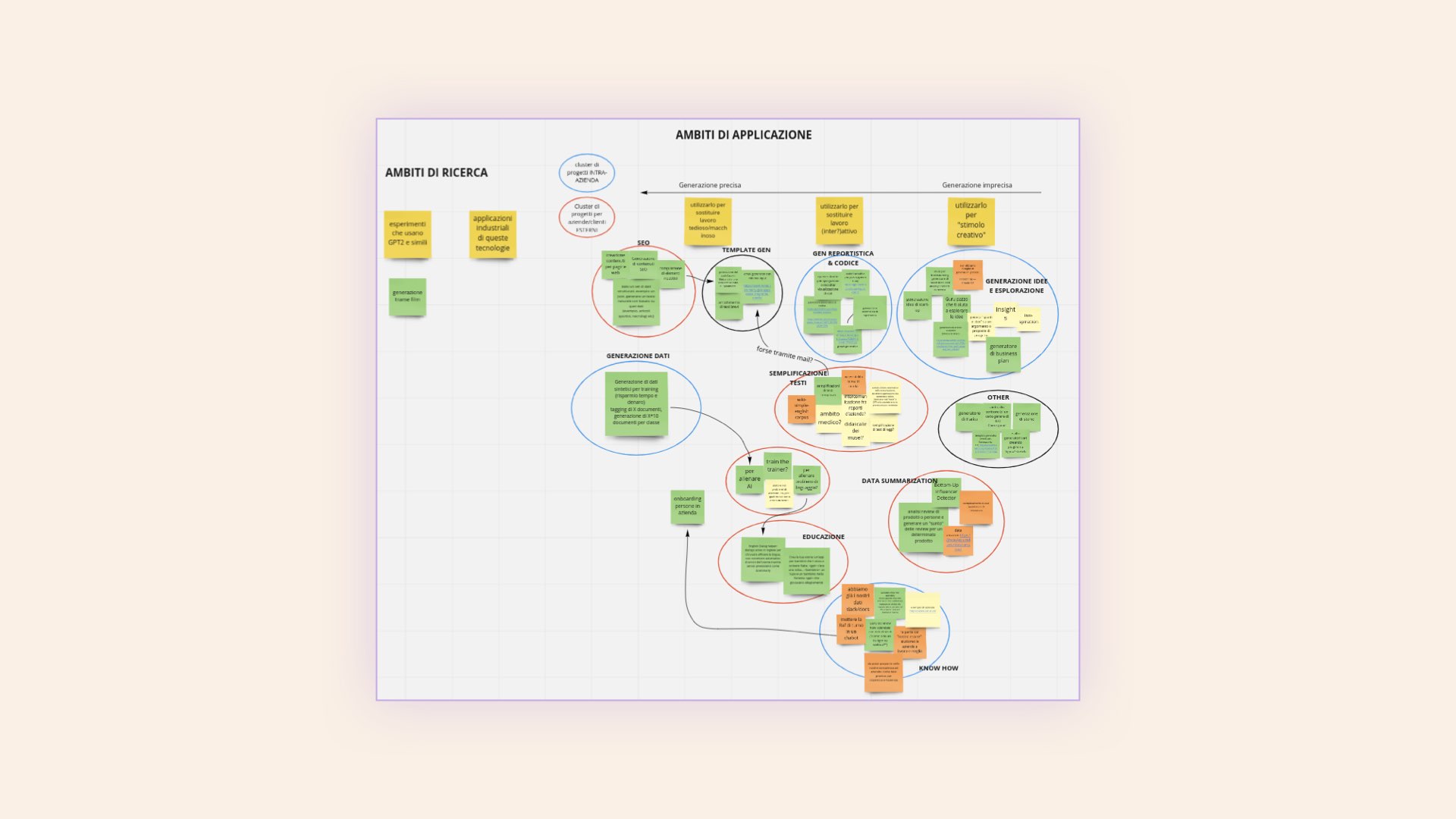 The Miro board we created during brainstorming. The arrow along the top edge shows the generation precision required for the analyzed use cases, grouped into 3 yellow macro-categories. Below the arrow, the use case clusters are orange for external customers and green for internal processes.