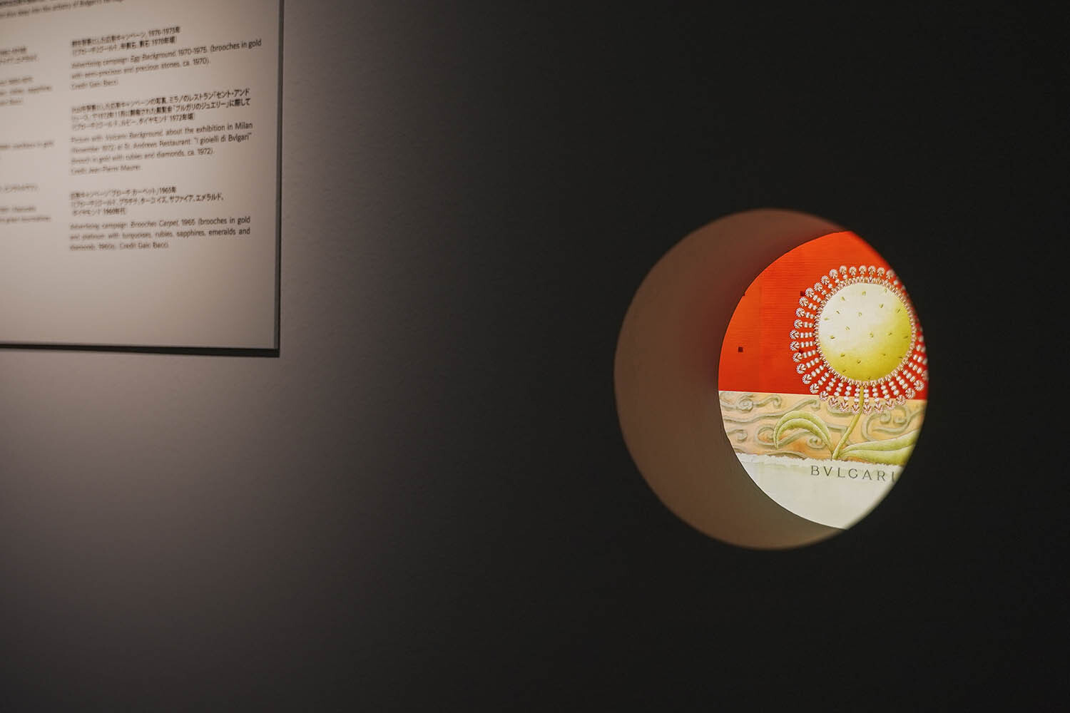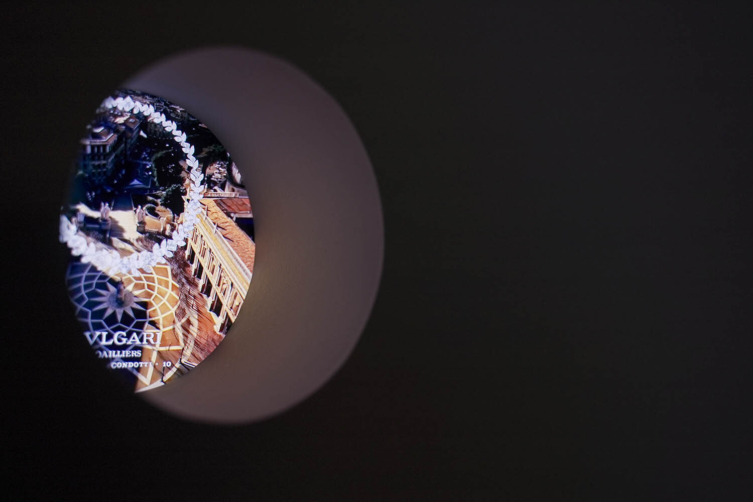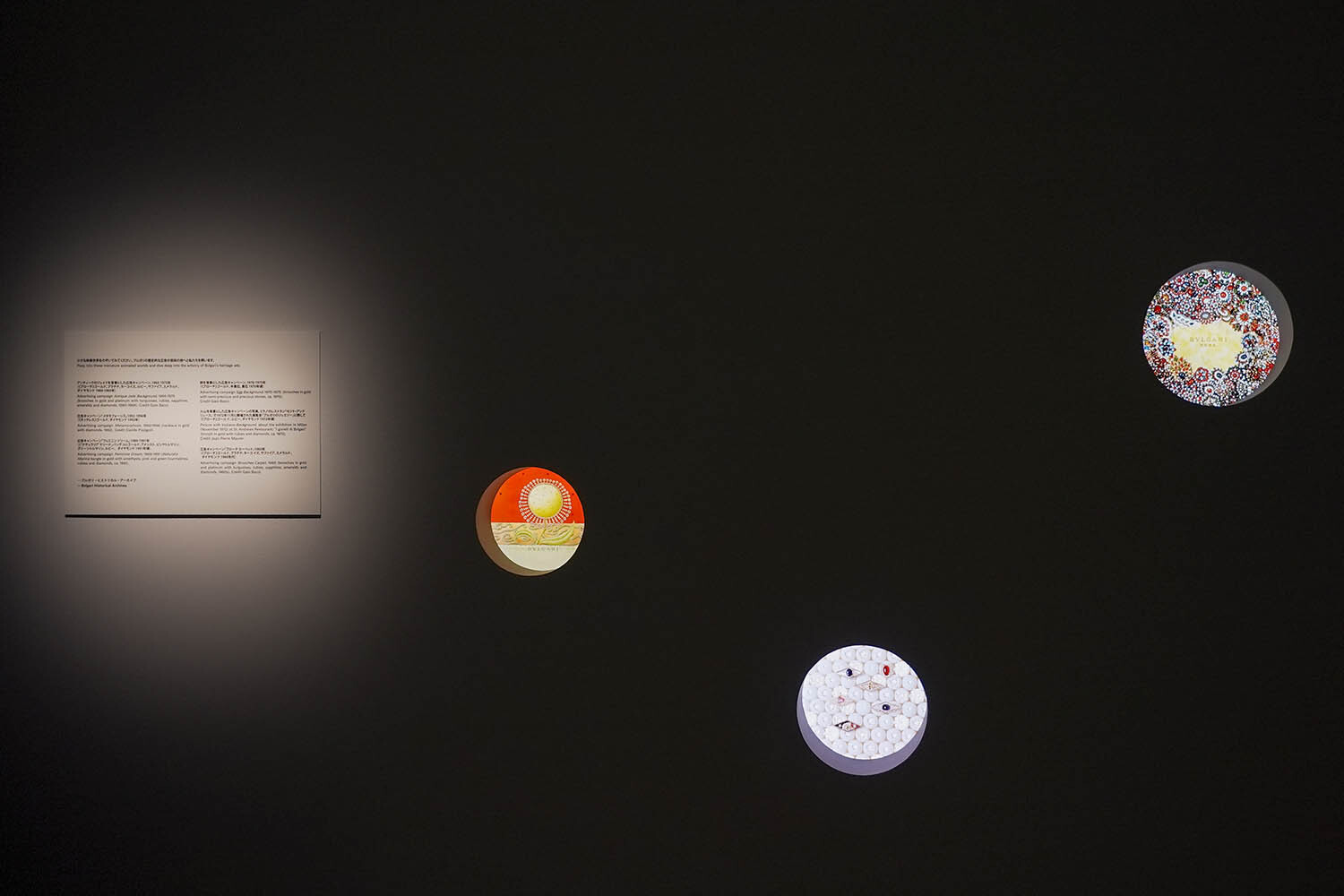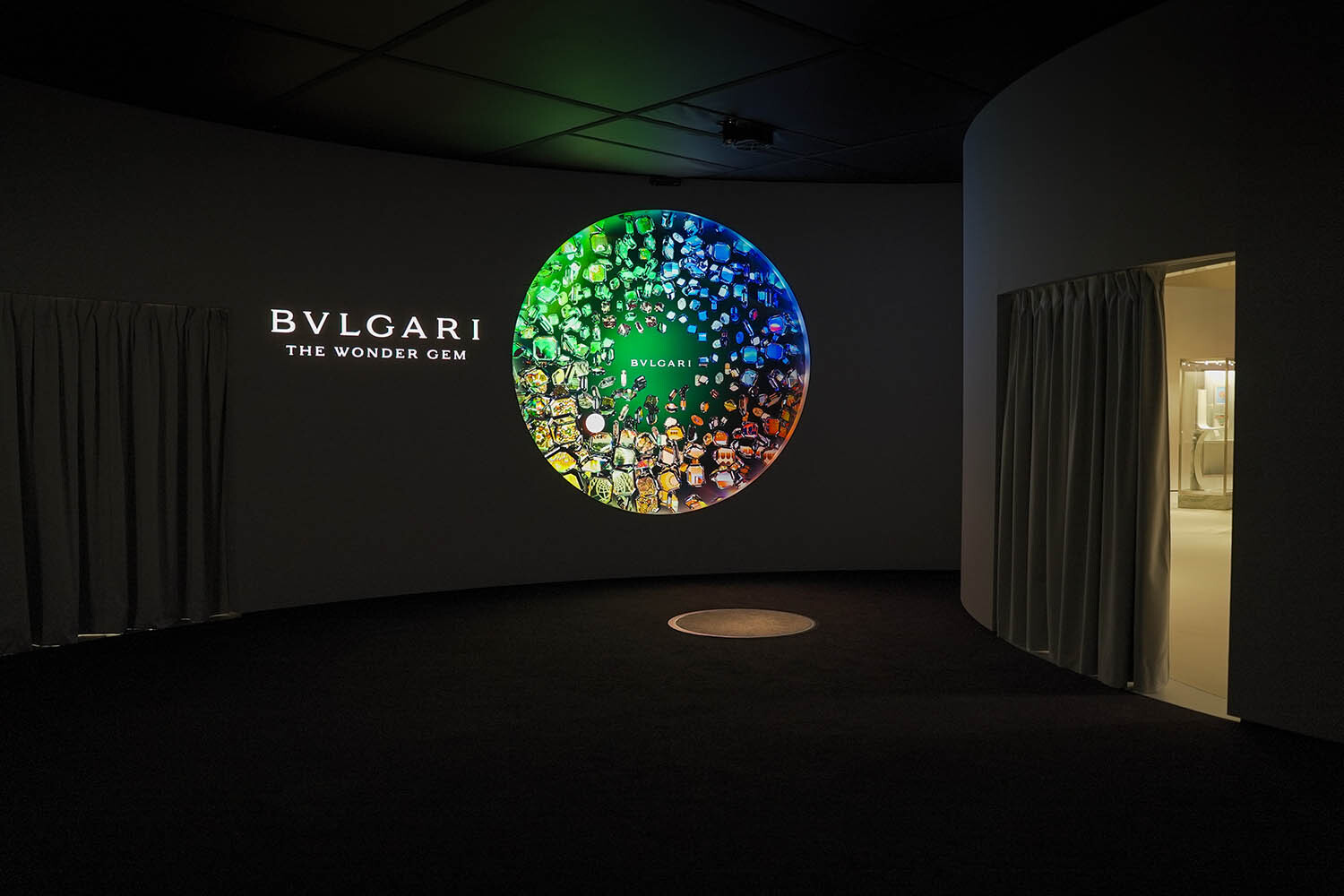 The Wonder Gem is an immersive room with a large circular projection activated by sensors and six wall screens, transforming Bvlgari's advertising heritage into an interactive experience.